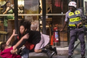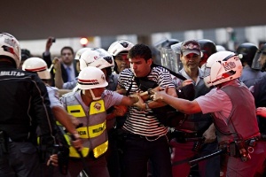 13.jun.2013 - Homem é contido por policiais durante manifestação contra aumento ...