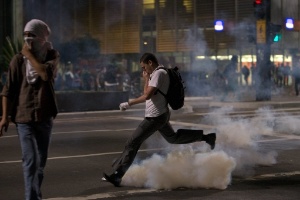13.jun.2013 - Manifestante chuta cápsula de bomba de gás lacrimogênio lançada ...