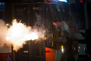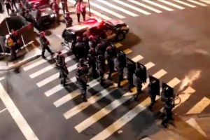 Atrás deles, a PM, com grande efetivo, disparou quantidade de balas de borracha e bombas de gás lacrimogêneo. Transeuntes que não estavam participando do protesto foram atingidos, como uma idosa de 67 anos, baleada no rosto logo após sair de uma igreja.