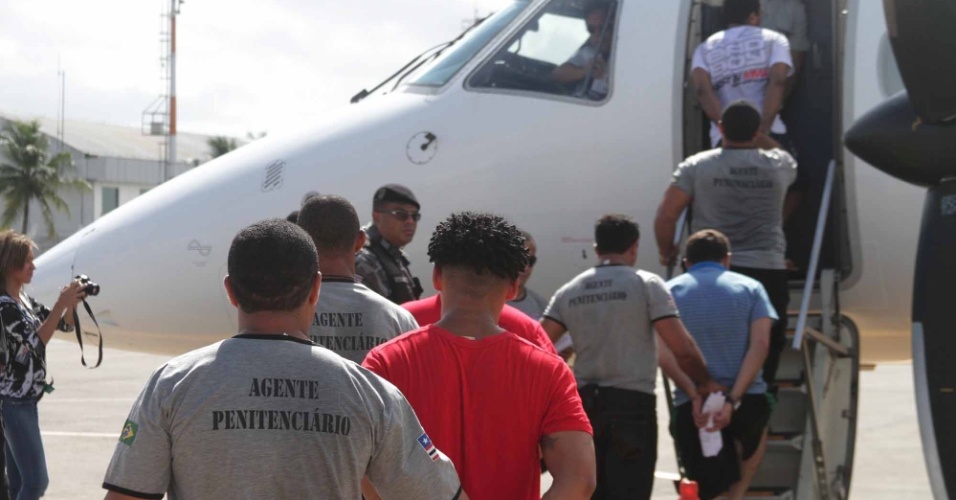 20.jul.2013 - Presos são encaminhados ao avião no Aeroporto Marechal Cunha Machado, em São Luís (MA), para serem levados para presídio de segurança máxima de Campo Grande (MS). Vinte agentes penitenciários viajaram para fazer a segurança dos presos Divulgação