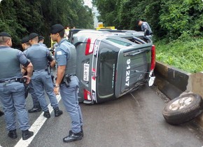 Uma viatura das Rondas Ostensivas Tobias de Aguiar (Rota), da Polícia Militar, capotou por volta das 11h desta quinta-feira (7) quando seguia de Cubatão (SP) para Guarujá , no litoral de São Paulo, pela Rodovia Cônego Domênico Rangoni.