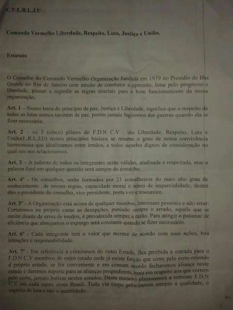 No texto, criado em 1979 dentro do presídio da Ilha Grande, no Rio de Janeiro, o CV esclarece a seus membros que "a facção está acima de qualquer membro ou interesse pessoal" e que os erros serão cortados na própria carne, inclusive com o "expurgo" constante dos integrantes.